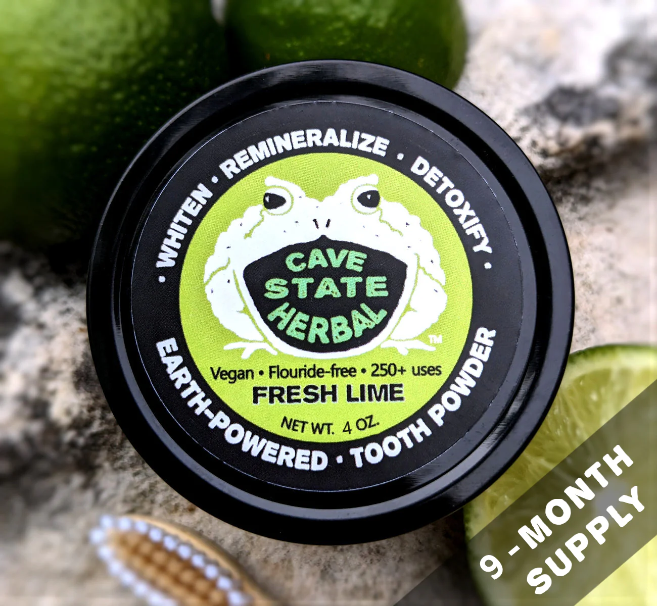 This tooth powder is hand-crafted for anyone looking for a natural alternative to conventional toothpastes. It is made of our seven-part synergistic blend of working natural ingredients for a safe, delicious, no-nonsense clean. It is vegan and paleo-friendly, and comes in a reusable, recylable steel tin with twist-off cap. The 4 oz size should last upwards of 550 brushings, or about 9 months for one person brushing 2x daily. How to use this stuff: Wet your toothbrush and tap off excess water. Lightly dip it into the tooth powder and brush as usual with the powder that sticks to your brush. (If you wish to keep moisture out of your tin, sprinkle a good pinch of powder onto the wet toothbrush instead.) To remove any extra “grit”, swish and rinse with water when you’re finished.
